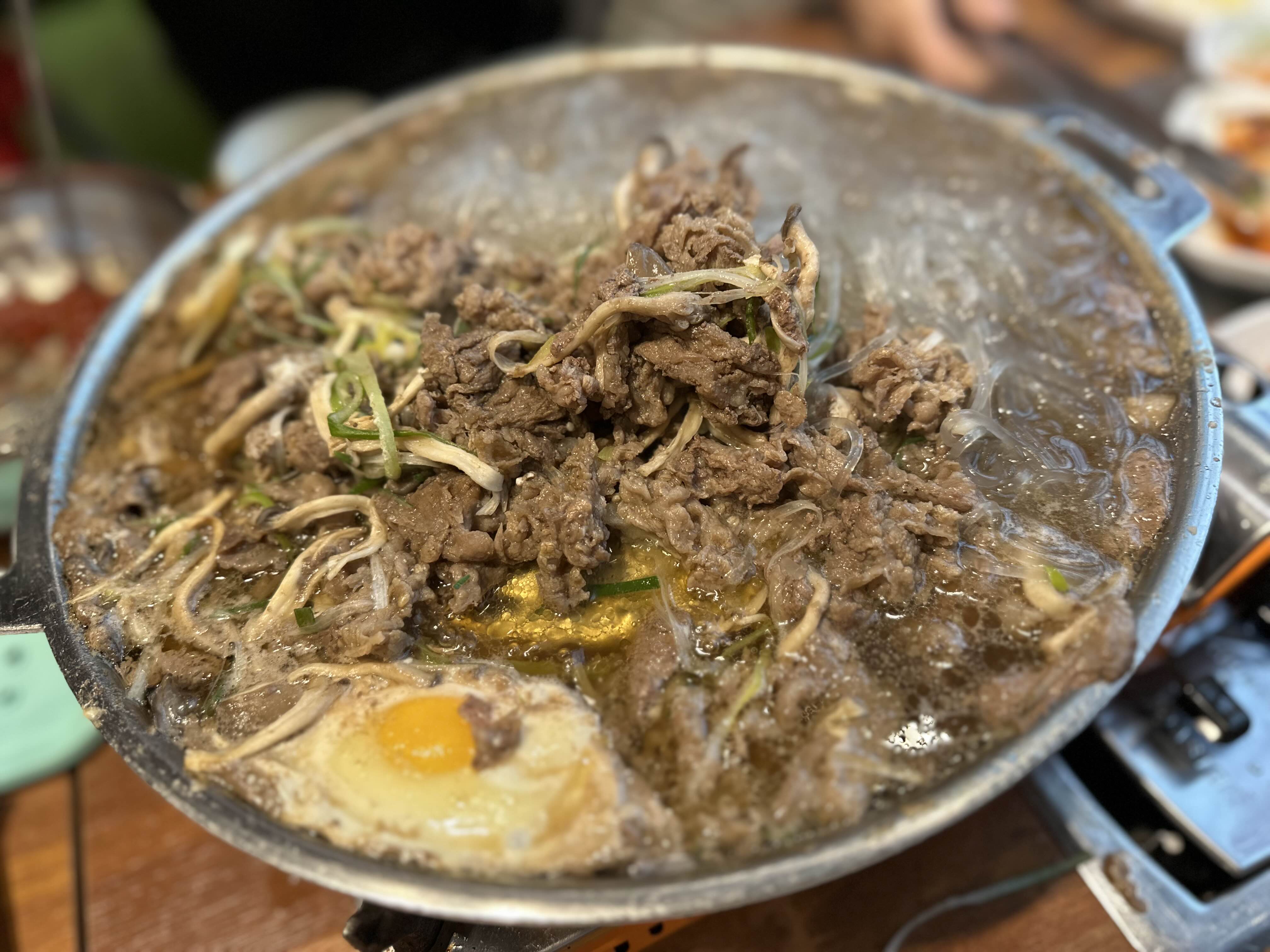 불고기가 어느 정도 익었을 때 당면사리를 투하한 모습이에요.
